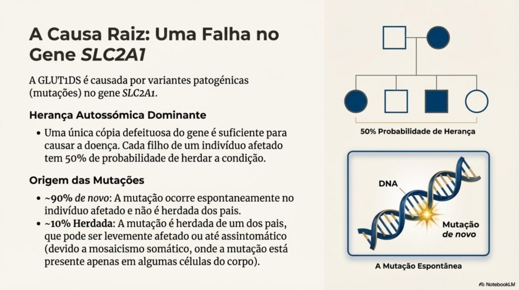 A Deficiência de GLUT1 está associada a alterações (variantes) no gene SLC2A1, que participa do funcionamento do transporte relacionado ao GLUT1. Em muitos casos, a condição pode ocorrer por uma alteração “nova” (não herdada), mas também pode haver herança familiar dependendo do caso.
