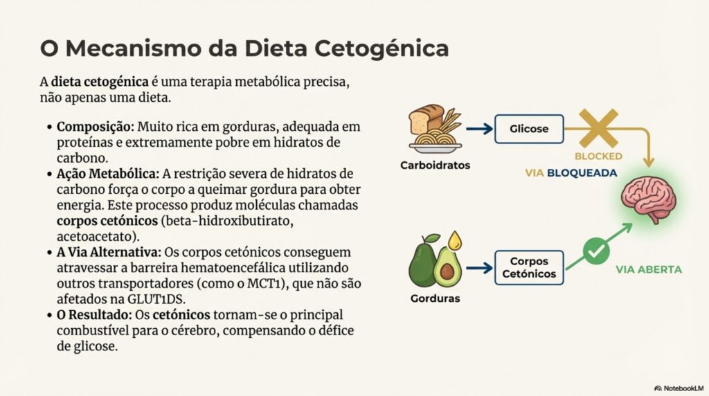 Em linguagem simples: a proposta metabólica envolve reduzir carboidratos e aumentar gorduras para estimular a produção de corpos cetônicos, que podem ser utilizados como fonte alternativa de energia pelo cérebro em contextos específicos.